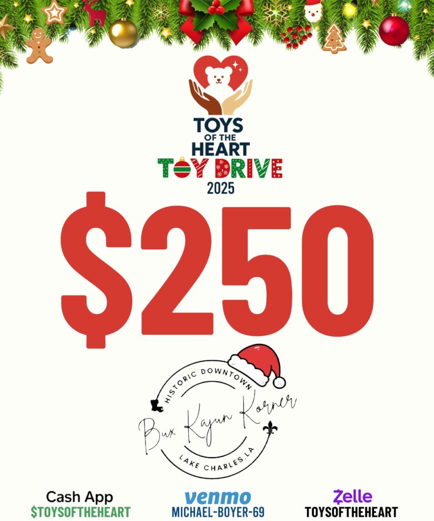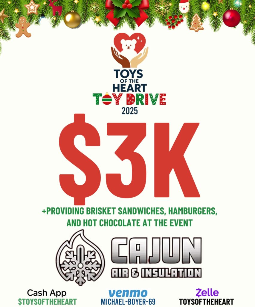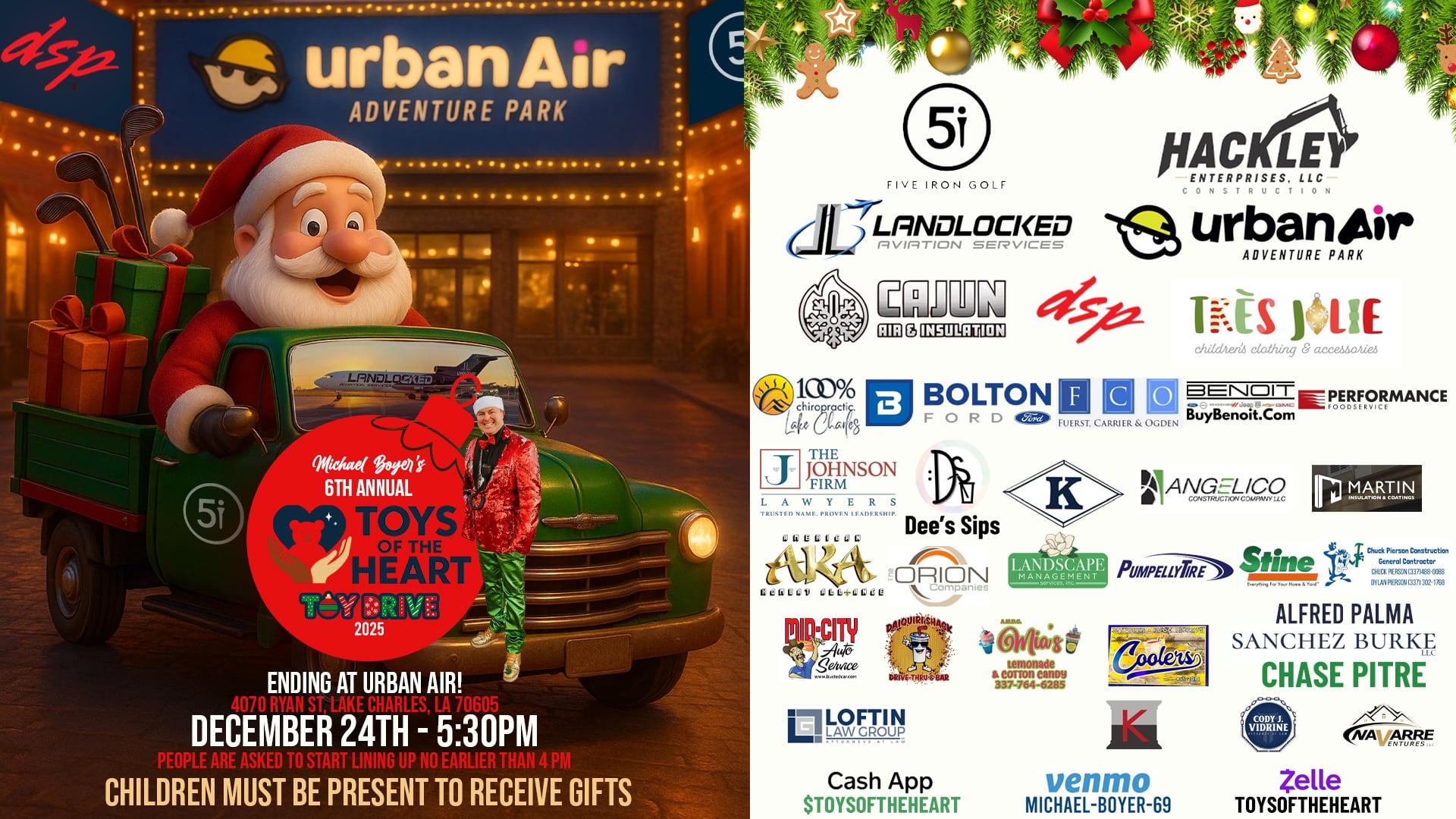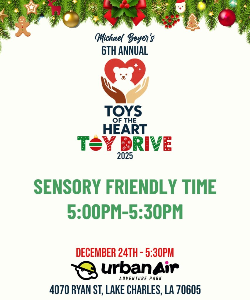 Join the community for Michael Boyer’s 6th Annual Toys of the Heart Toy Drive on December 24th at 5:30 PM, ending at Urban Air Adventure Park, located at 4070 Ryan St., Lake Charles, LA 70605. Families are encouraged to line up no earlier than 4:00 PM.